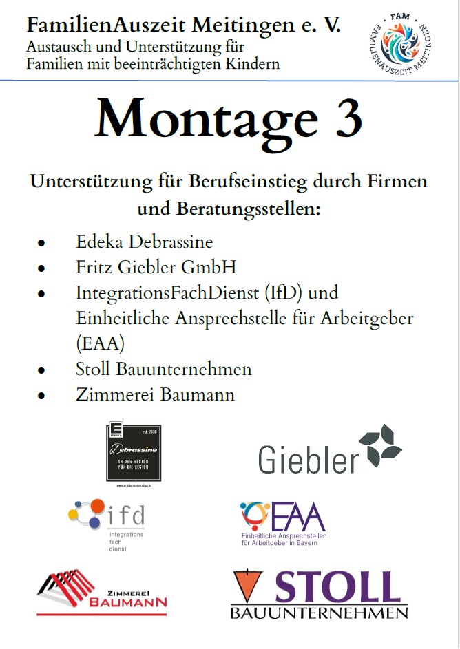 - Integrationsfachdient Augsburg/Donauwörth (u.a. Unterstützer bei der Integration in den 1. Arbeitsmarkt für beeinträchtigte Personen)